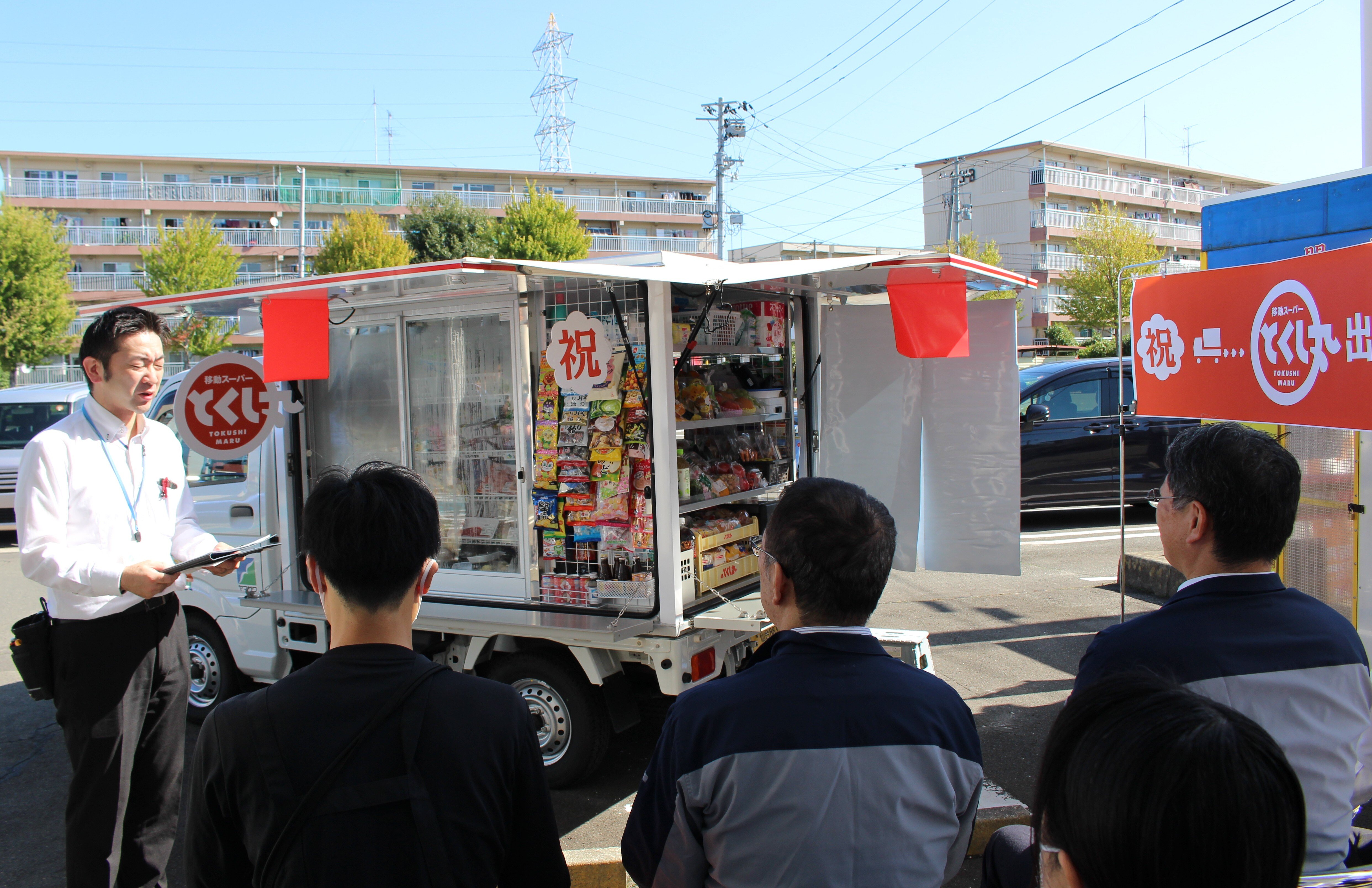 移動スーパー「とくし丸」は、日常の買い物に不自由されているお客様の玄関先へ専用車両でおうかがいし、会話をしながら商品を選んで買物していただくサービスです。