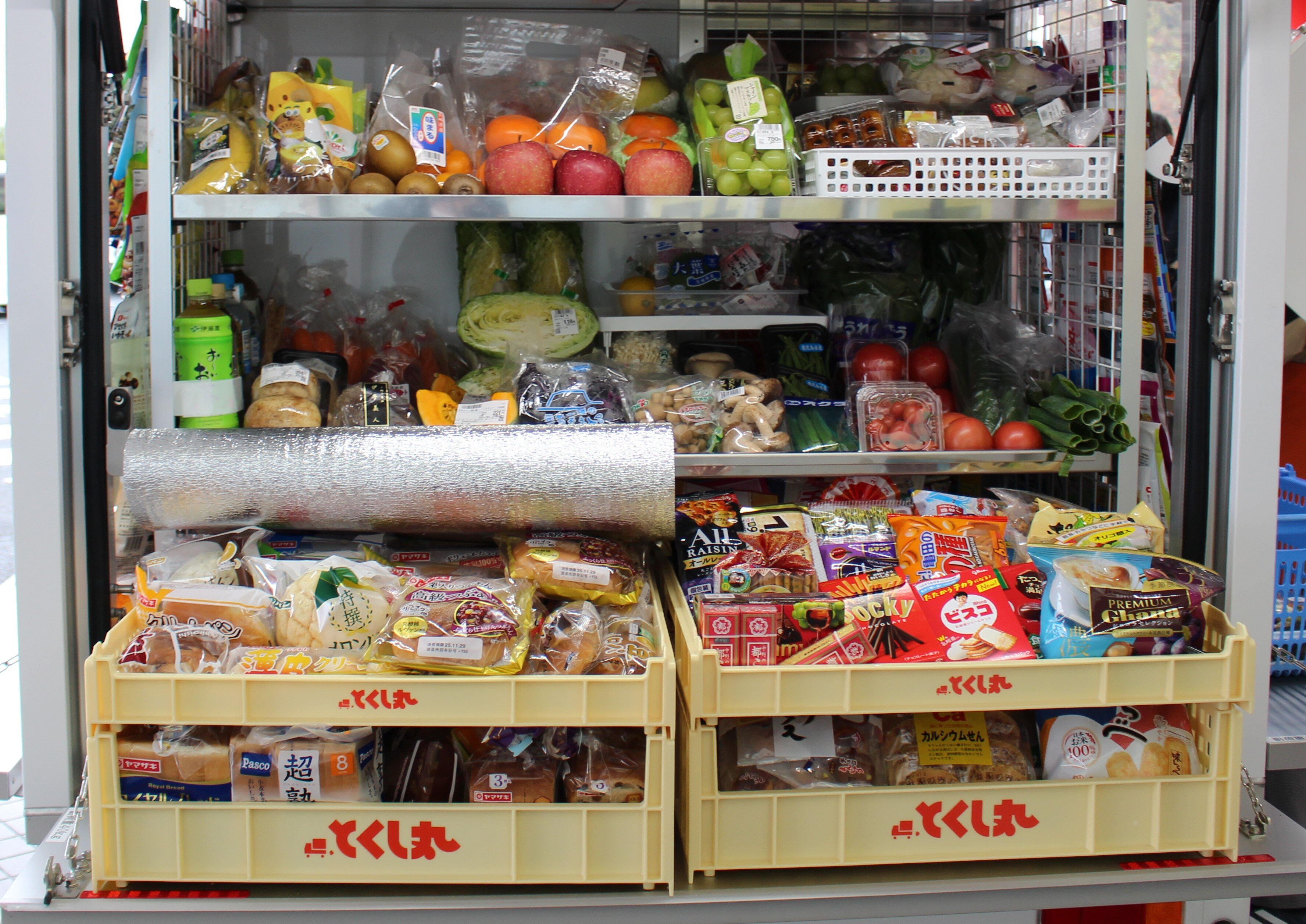 とくし丸はお刺身やお肉など生鮮食品を鮮度抜群で運べる保冷車です。さらに、お弁当、お惣菜を保温する専用保温庫など、おいしさをキープする設備を搭載しています。