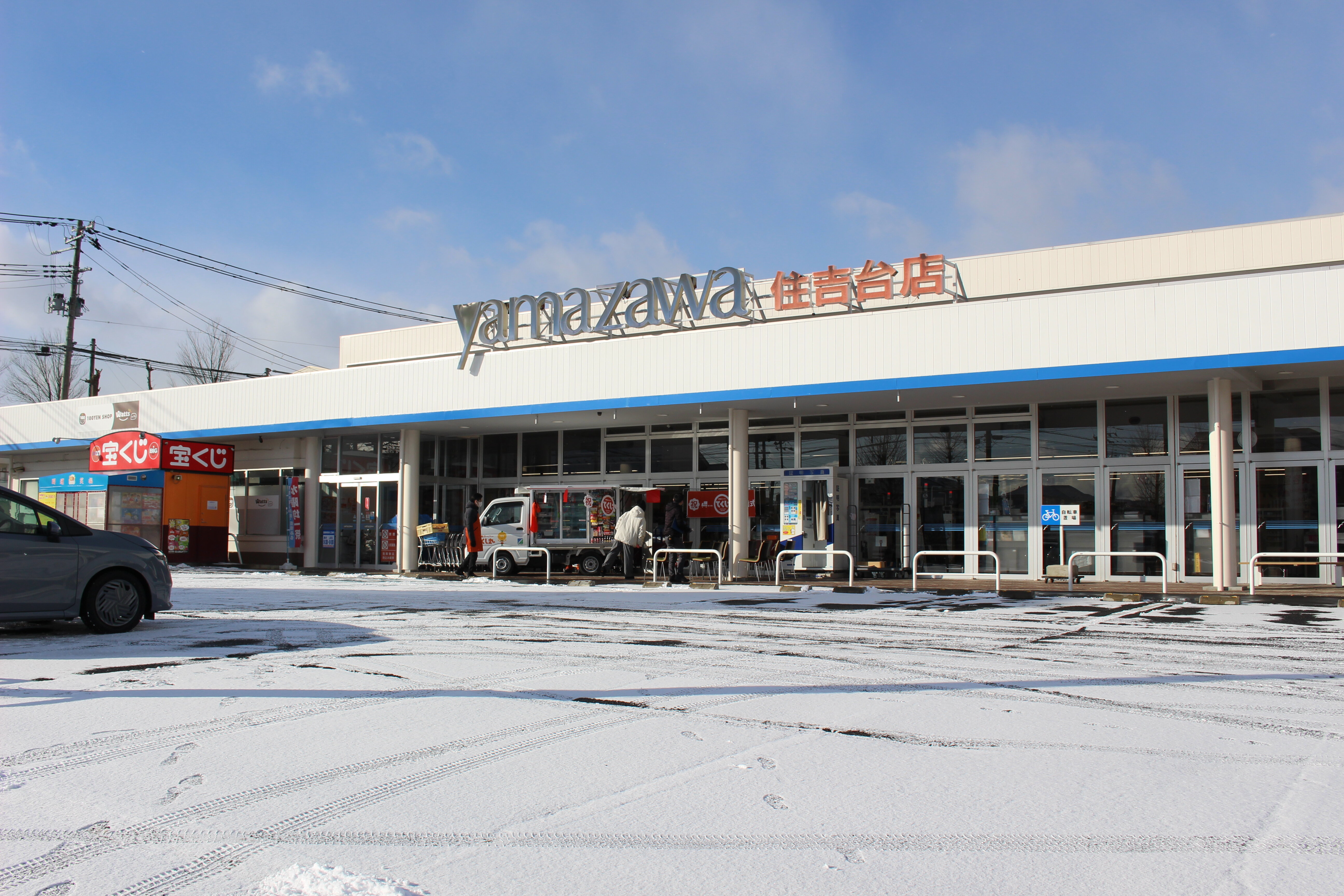 今季最強・最長寒波襲来と報道される中、ヤマザワ住吉台店の駐車場にも雪が積もり、冷え込む朝となりましたが、出発前はまぶしいくらいの青空に回復しました。