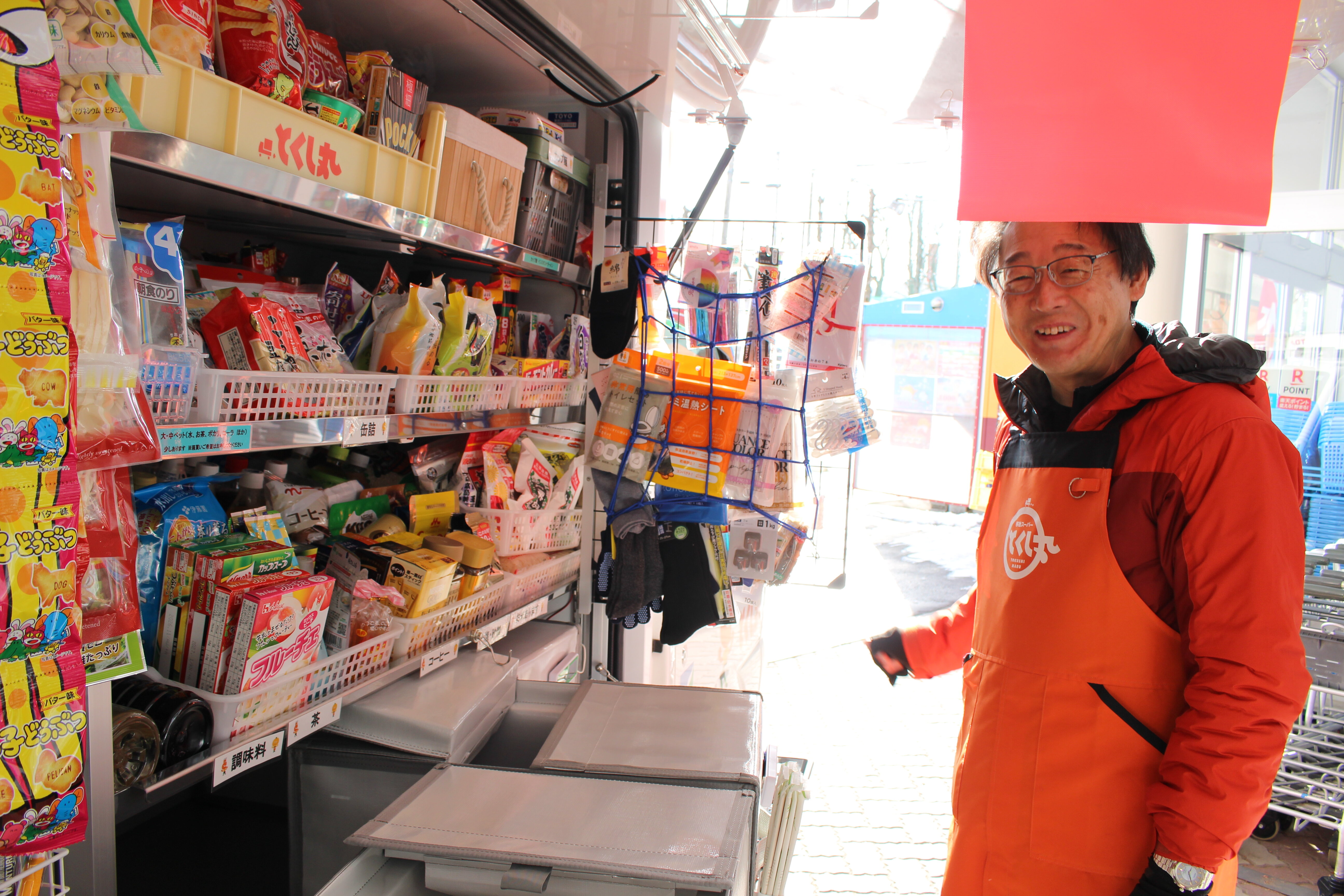 36号車の販売パートナーの髙橋さんは全身「とくし丸」カラーに身を包み、防寒対策もばっちりです。天候次第ではお買い物に行きたくても外出が難しいお客様もいらっしゃいます。そんな時こそ、販売パートナーさんがご自宅前でお買い物のお手伝いをさせていただきます!
