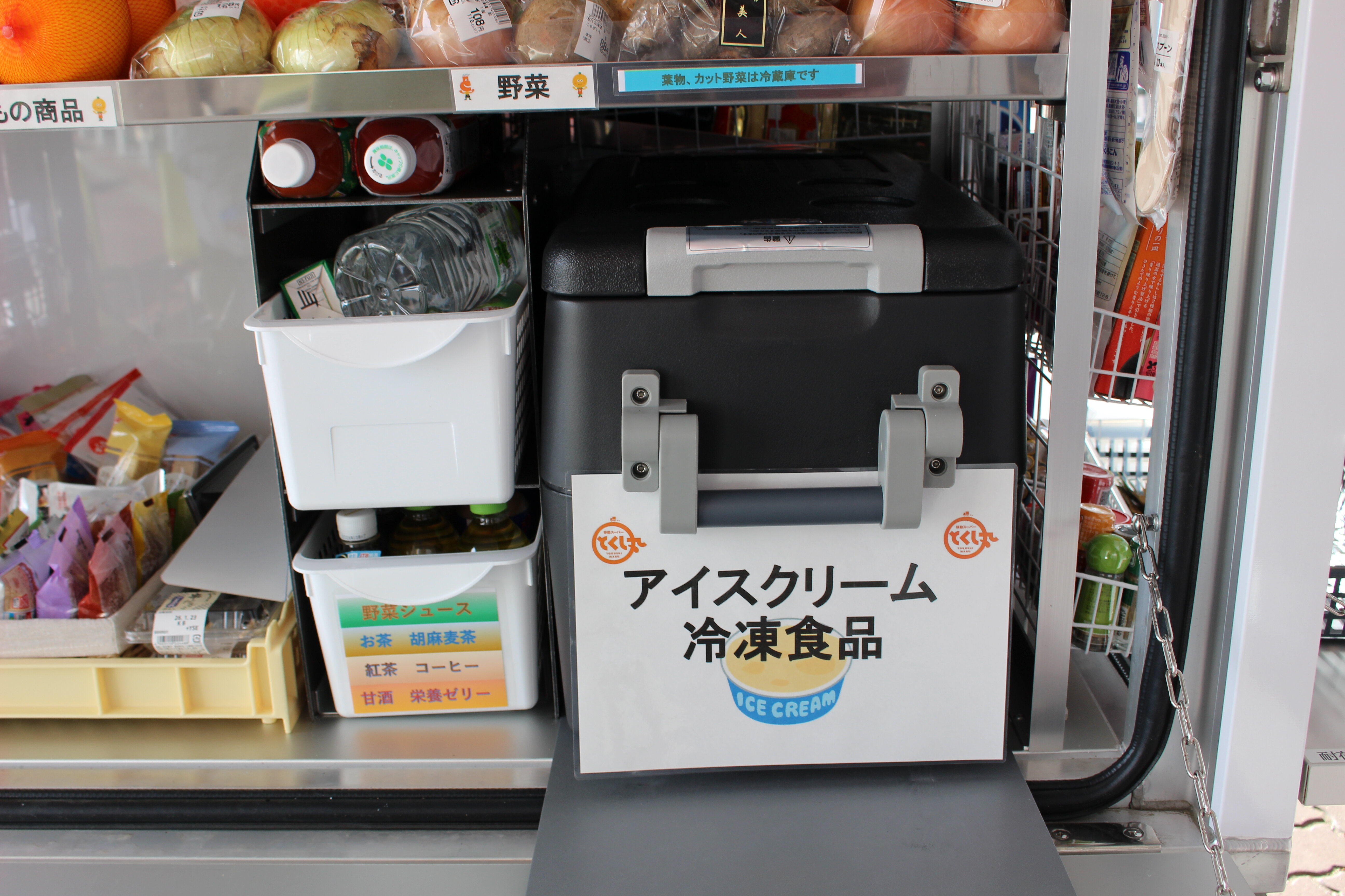 とくし丸はお刺身やお肉など生鮮食品を鮮度抜群で運べる保冷車です。さらに、お弁当、お惣菜を保温する専用保温庫、冷凍食品・アイス用の冷凍庫などおいしさをキープする設備を搭載しています。