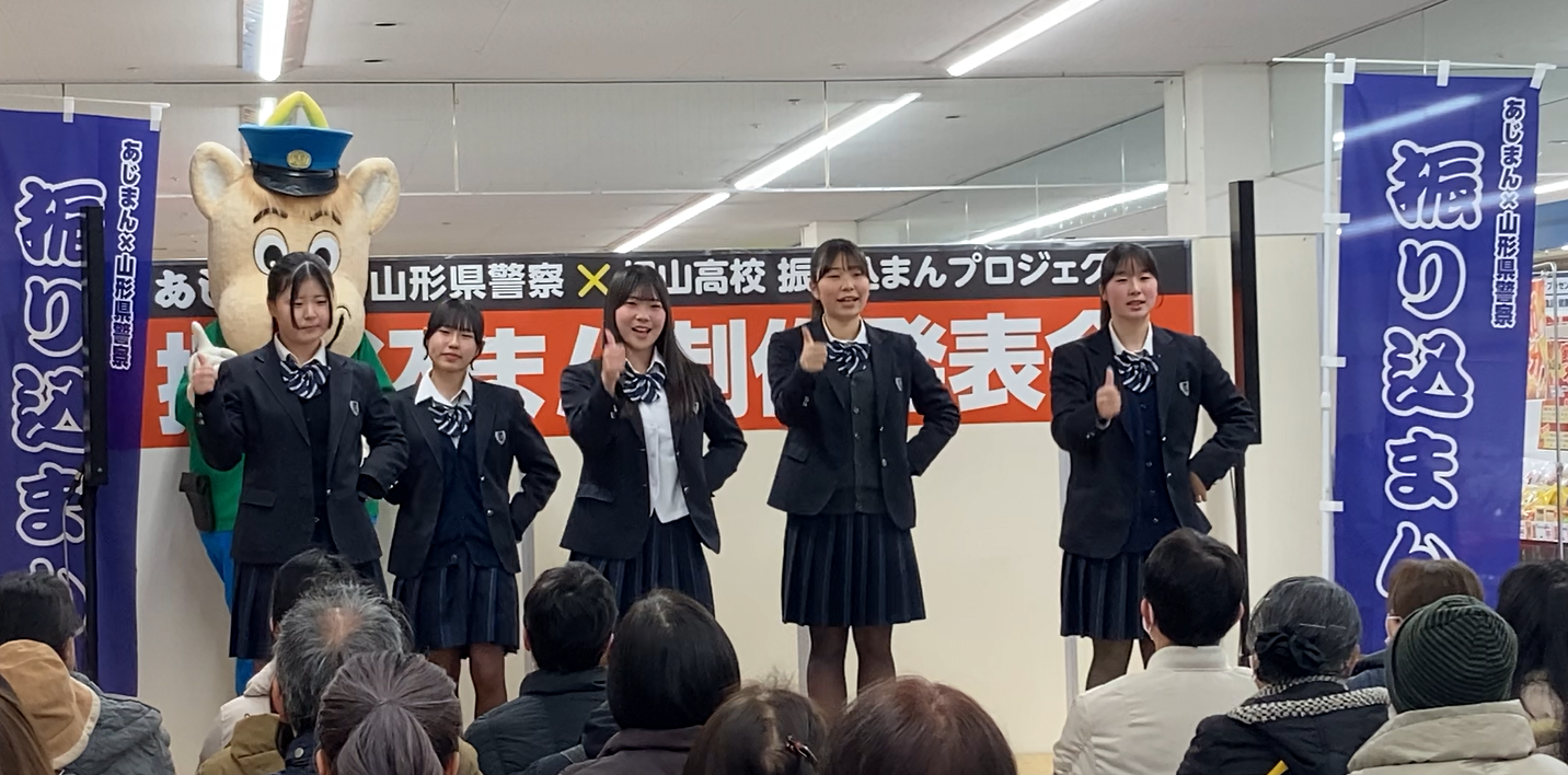2026年1月31日(土)、ヤマザワ北町店において、産官学連携‟あじまん×山形県警察×惺山高校 振り込まんプロジェクト"特殊詐欺防止「振り込まん制作発表会」が開催されました。