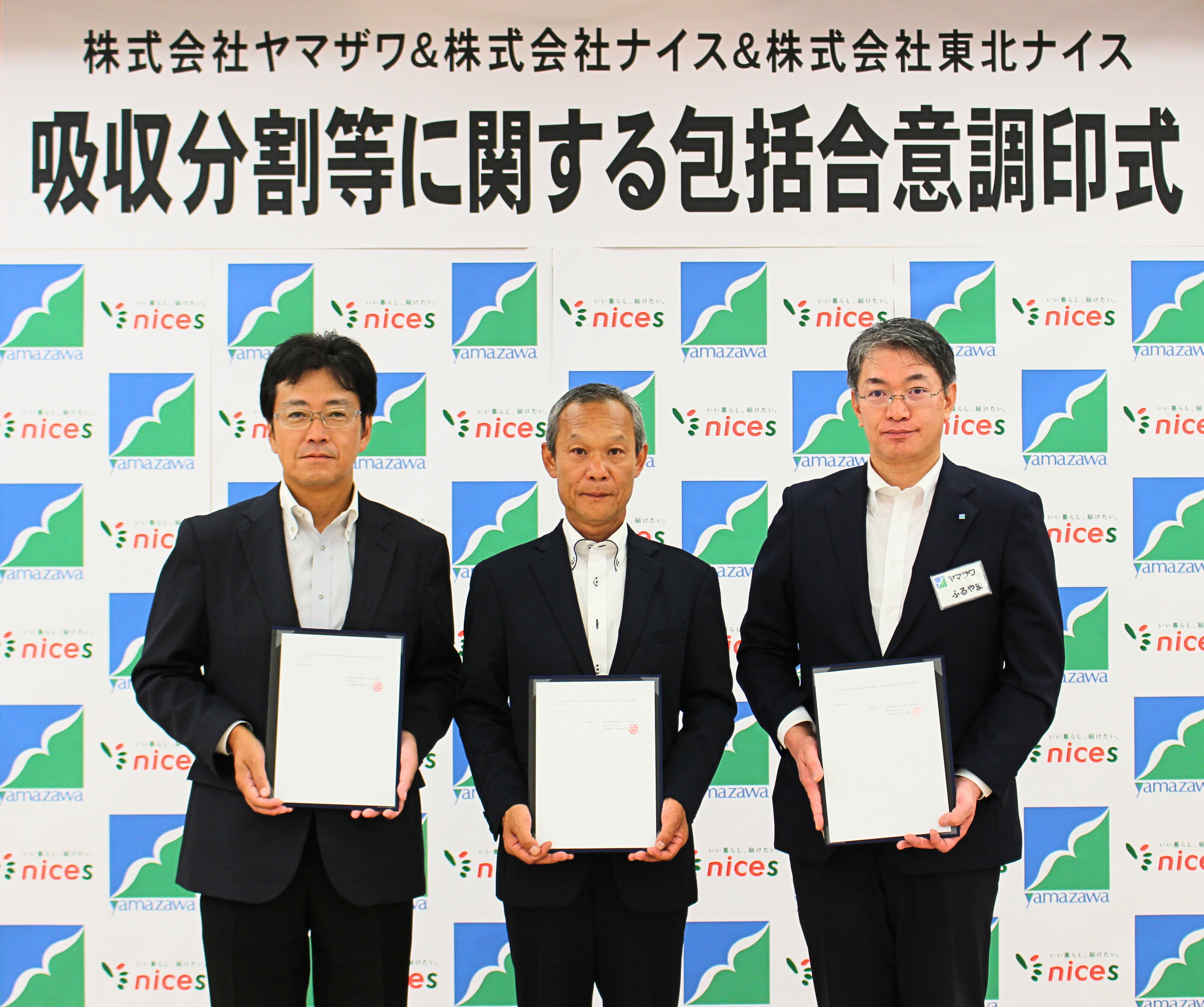 2025 年10月6 日、株式会社ヤマザワ(山形県山形市)は当社本社において、株式会社ナイス(秋田県秋田市)、株式会社東北ナイスと秋田県内6店舗のスーパーマーケット事業、フィットネス事業及び不動産事業等の吸収分割等に関する包括合意調印式を執り行いましたので、お知らせいたします。